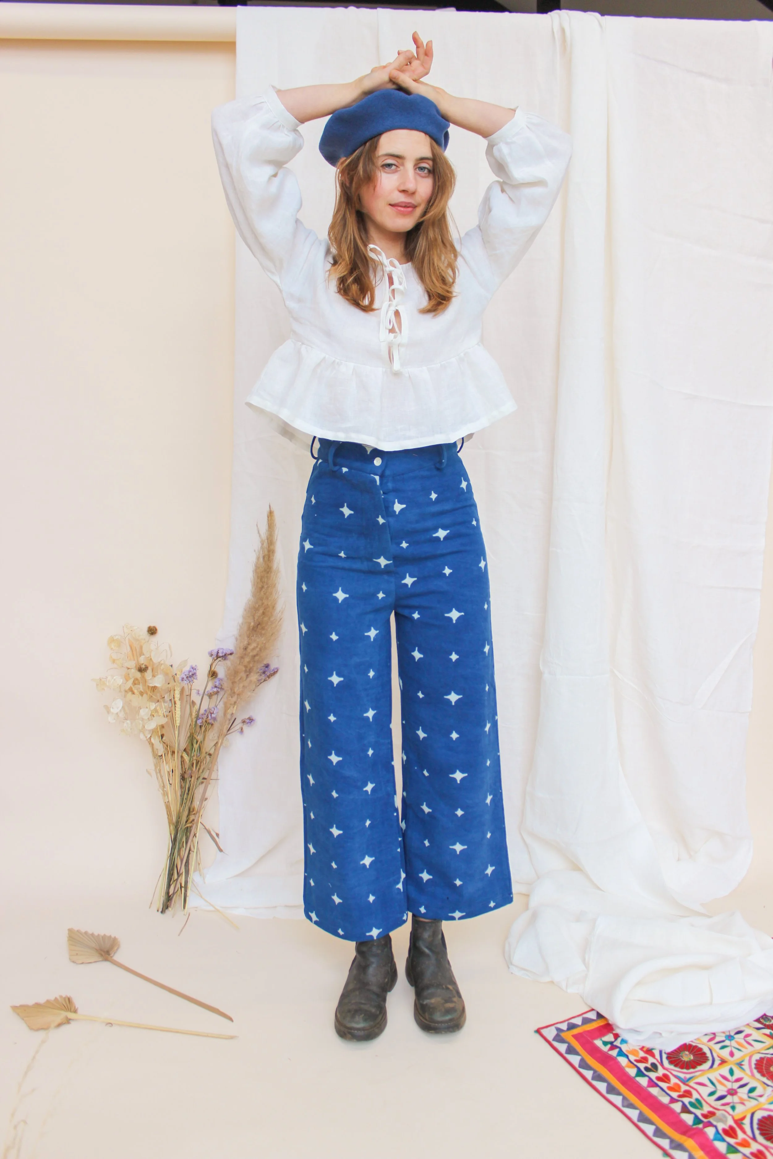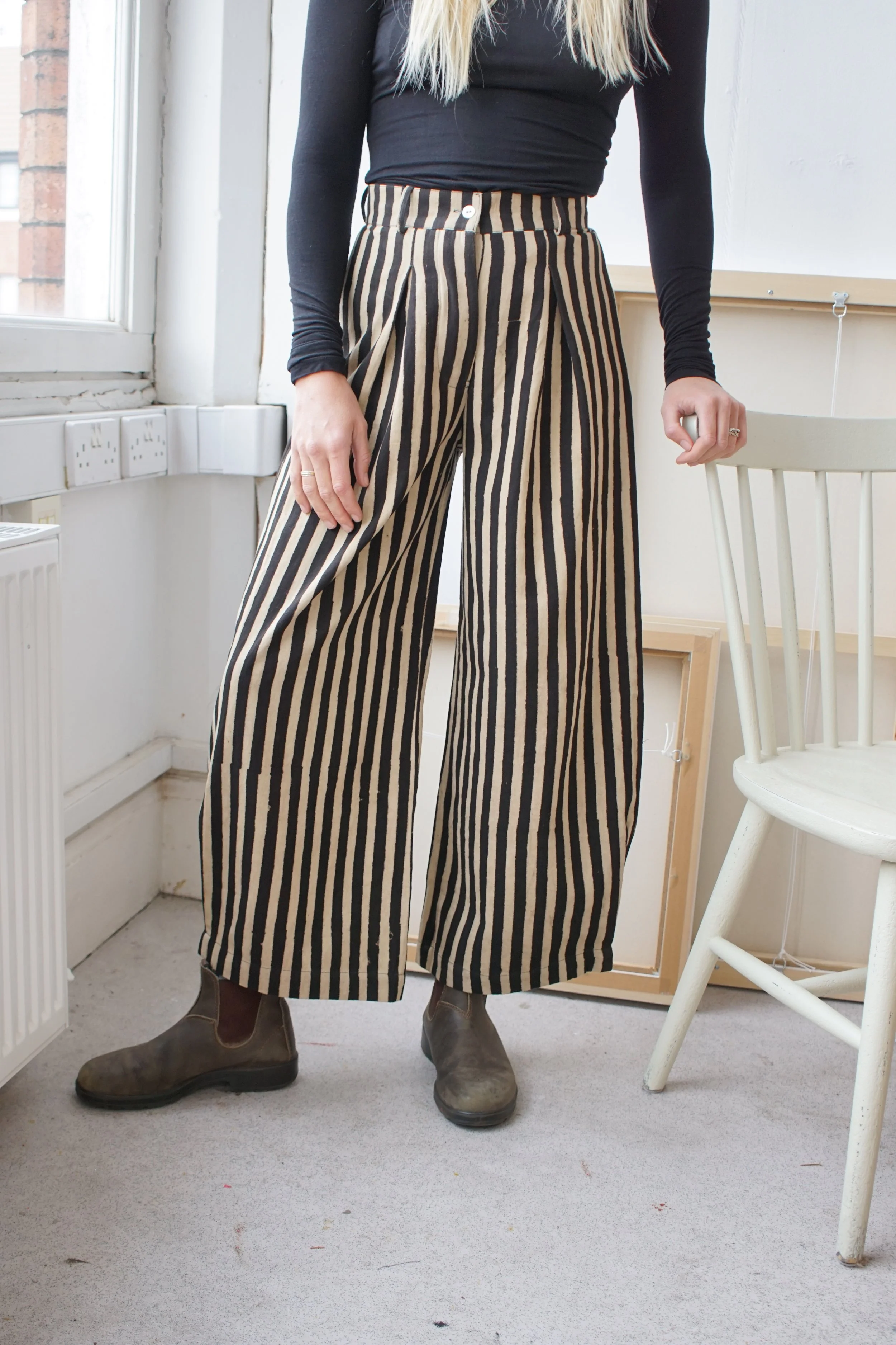 The Piper trousers! They’ve been in the pipeline for so long and we’re so in love with them. High waisted, slightly cropped wide leg jeans with two back pockets and 5 shell button fly. They’re incredibly flattering and comfortable all at the same time. We’ve created a dabu printed gingham with a rusty red and yellow stripe to create an autumnal brown/orange look. The sizes are based on waist size so please measure your waist before purchasing as they could differ to other brands.